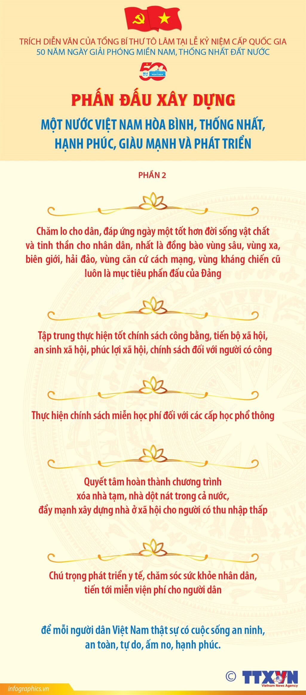 Trong bài diễn văn tại Lễ kỷ niệm cấp quốc gia 50 năm Ngày Giải phóng miền Nam, thống nhất đất nước ngày 30/4/2025, Tổng Bí thư Tô Lâm khẳng định: Là một dân tộc đã trải qua muôn vàn đau thương và tổn thất vì chiến tranh trong quá khứ và cũng là dân tộc được thụ hưởng những lợi ích to lớn từ hòa bình, hợp tác hữu nghị trong những thập kỷ vừa qua. Việt Nam tha thiết mong muốn cùng cộng đồng quốc tế xây dựng một tương lai hòa bình, thịnh vượng, đoàn kết, phát triển. Việt Nam quyết tâm thực hiện thắng lợi các mục tiêu chiến lược đến năm 2030, trở thành nước đang phát triển, có công nghiệp hiện đại, thu nhập trung bình cao; đến năm 2045, trở thành nước phát triển, thu nhập cao theo định hướng XHCN; Triển khai mạnh mẽ chính sách hòa hợp, hòa giải dân tộc với tinh thần chúng ta đều mang dòng máu Lạc Hồng, đều là anh em ruột thịt, “như cây một cội, như con một nhà”; Đẩy mạnh thực hiện phương châm “Việt Nam là bạn, là đối tác tin cậy và là thành viên tích cực, có trách nhiệm của cộng đồng quốc tế”; nỗ lực xây dựng Đảng trong sạch, vững mạnh, toàn diện để Đảng thật sự “là đạo đức, là văn minh”, tiêu biểu cho trí tuệ, danh dự, lương tri của dân tộc và thời đại, xứng đáng với niềm tin, sự lựa chọn và sự kỳ vọng của Nhân dân...