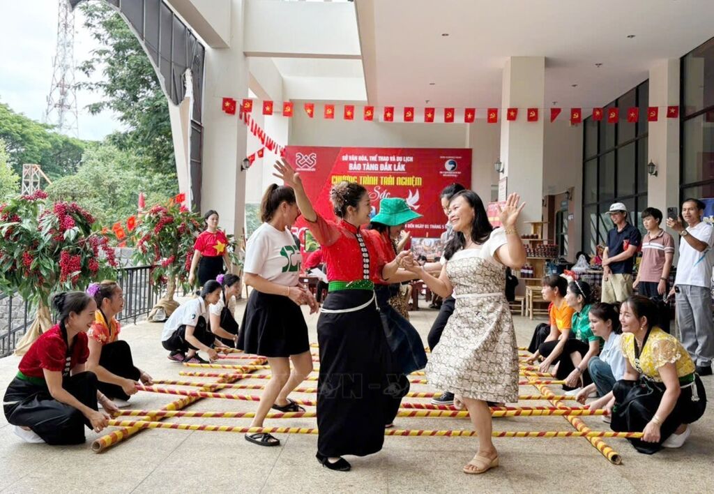 | Du khách cùng nhảy sạp trong dịp nghỉ lễ 30/4 - 1/5/2025 tại Bảo tàng Đắk Lắk. |