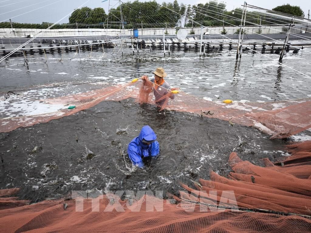 | Nông dân thu hoạch tôm công nghệ cao. Ảnh: Công Trí-TTXVN |