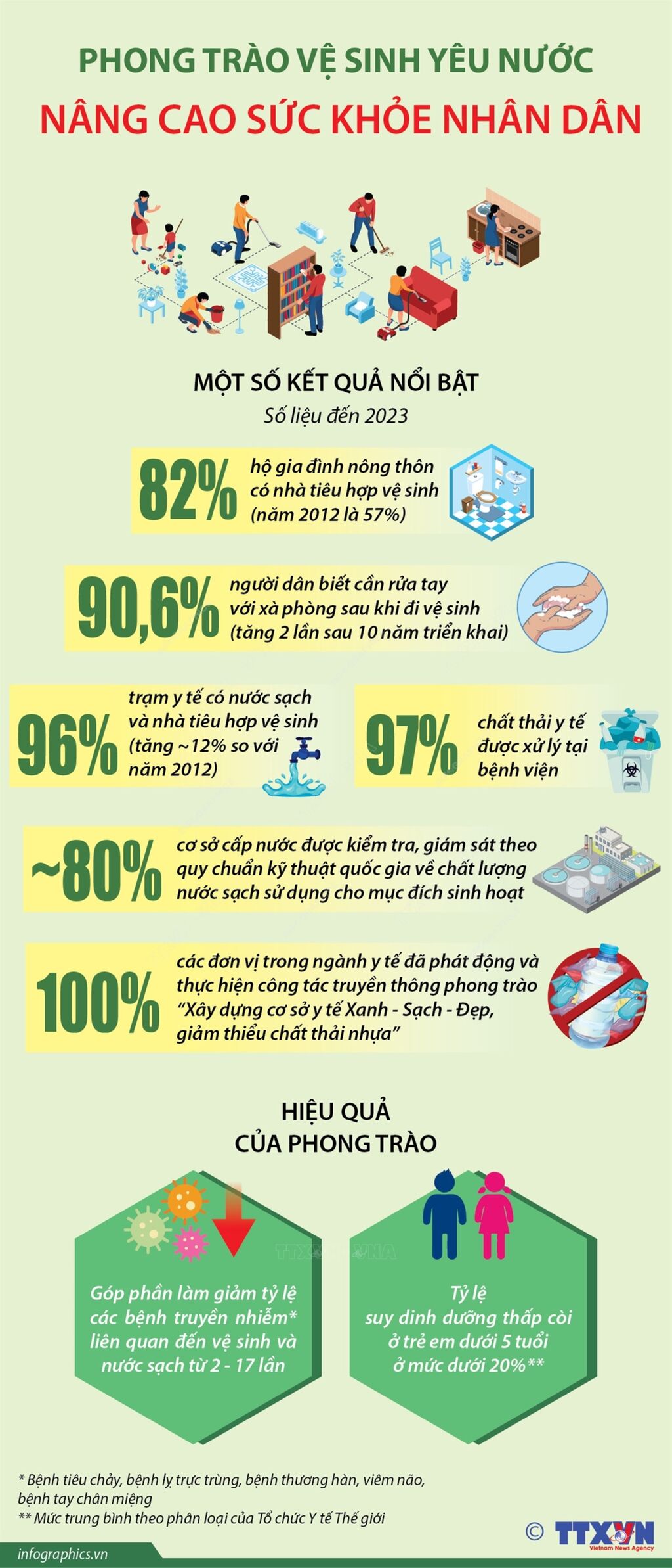 Hưởng ứng lời kêu gọi “Vệ sinh yêu nước” của Chủ tịch Hồ Chí Minh, ngày 19/6/2012, Thủ tướng Chính phủ đã ban hành Quyết định số 730/QĐ-TTg về việc lấy ngày 2 tháng 7 hằng năm là Ngày Vệ sinh yêu nước. Phong trào Vệ sinh yêu nước với mục đích nhằm nâng cao sức khỏe nhân dân, đồng thời kêu gọi toàn dân tích cực tham gia các hoạt động vệ sinh cá nhân, vệ sinh môi trường nhằm nâng cao hiệu quả phòng chống dịch bệnh và cải thiện sức khỏe. Những năm qua phong trào đã đạt được nhiều kết quả quan trọng đáng khích lệ. Thói quen, hành vi về vệ sinh cá nhân, vệ sinh môi trường của cộng đồng đã có sự thay đổi cơ bản. Công tác đảm bảo nước sạch, vệ sinh cá nhân, vệ sinh môi trường, an toàn vệ sinh thực phẩm, vệ sinh lao động và phòng chống bệnh nghề nghiệp, vệ sinh trong cơ sở y tế, cơ sở giáo dục đã từng bước được cải thiện. Các kết quả này đã góp phần giảm đáng kể các bệnh truyền nhiễm gây dịch ở nước ta…