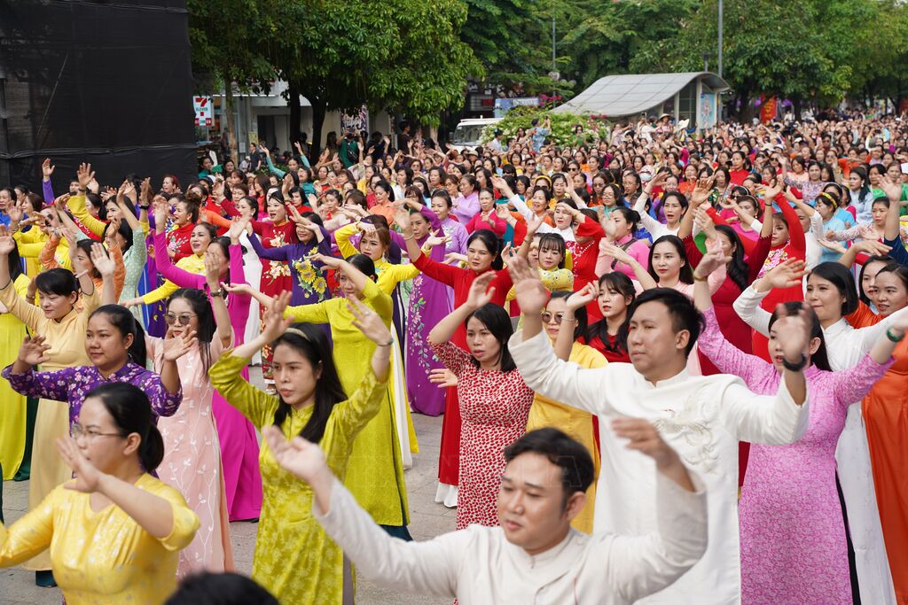 | Tiết mục đồng diễn áo dài trên phố đi bộ Nguyễn Huệ được đông đảo người dân tham gia. |