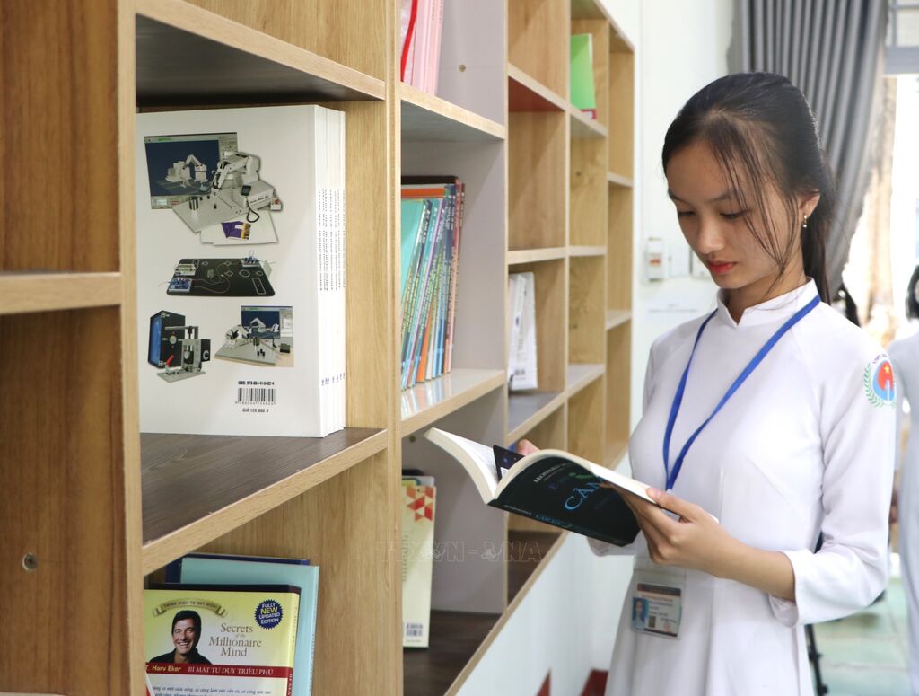 Các trường học tại Quảng Ngãi đang đẩy mạnh đổi mới thư viện qua việc kết hợp mô hình số hiện đại và không gian truyền thống thân thiện. Sự đột phá từ thư viện số giúp học sinh tiếp cận tri thức linh hoạt, trong khi thư viện chuẩn quốc gia nuôi dưỡng cảm hứng đọc trực tiếp. Với sự chỉ đạo từ ngành giáo dục, hệ sinh thái này góp phần lan tỏa mạnh mẽ văn hóa đọc, hình thành thói quen tự học bền vững cho thế hệ trẻ. Ảnh: Đinh Hương – TTXVN