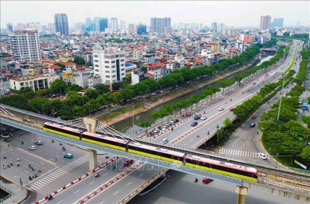 | Tàu điện trên cao tuyến đường sắt đô thị Cát Linh - Hà Đông vận hành qua khu vực trung tâm Hà Nội. Sự phát triển của hệ thống giao thông công cộng chạy điện góp phần giảm phụ thuộc vào nhiên liệu hóa thạch, đồng thời thúc đẩy xu hướng sử dụng phương tiện xanh trong bối cảnh giá xăng tăng cao. |