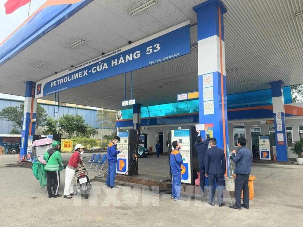 | Lực lượng Quản lý thị trường dán số điện thoại đường dây nóng tại các cửa hàng xăng dầu trên bộ. Ảnh: Thanh Vân-TTXVN |