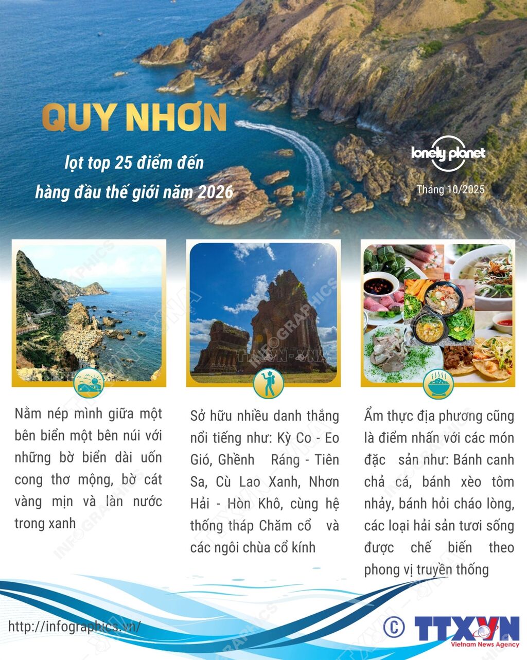 Tạp chí du lịch Australia Lonely Planet vừa công bố danh sách 25 điểm đến hàng đầu thế giới năm 2026. Theo đó, Quy Nhơn (Gia Lai), đại diện duy nhất của Việt Nam được lọt vào danh sách này, bên cạnh nhiều địa danh nổi tiếng từ Brazil, Mexico, Ireland…