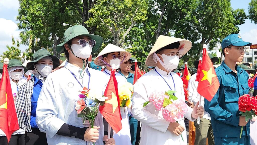 | Các thành viên khối diễu hành Mặt trận Tổ quốc miệt mài luyện tập trong cái nắng phương Nam. |