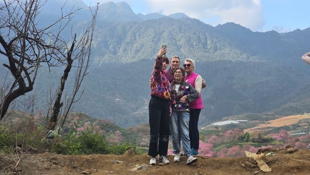 Sa Pa (Lào Cai) đang bước vào mùa mai anh đào đẹp nhất trong năm, thu hút đông khách du lịch đến thưởng ngoạn. Mùa hoa mai anh đào chỉ kéo dài vài tuần nên trong khoảng thời gian này, nhiều du khách đã ghé thăm các địa điểm nổi tiếng của Sa Pa như đồi chè Ô Long, đèo Ô Quy Hồ... để ghi lại những khoảnh khắc tuyệt đẹp. Ảnh: Hương Thu - TTXVN