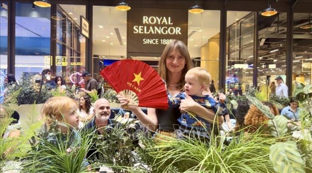 | Khán giả thích thú tạo dáng với sản phẩm thủ công là chiếc quạt mang lá cờ Việt Nam. Ảnh: TTXVN phát |