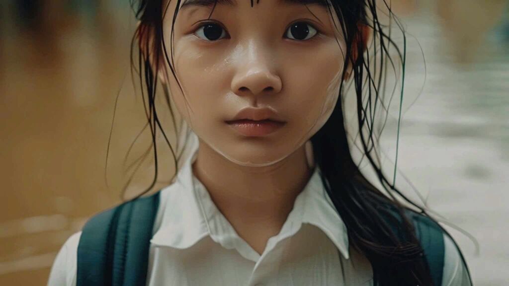 Trong “Mắt bão” có hình ảnh cây cầu Phong Châu, hình ảnh những ngôi nhà chìm trong nước lũ, người dân dầm mình trong mưa lũ, đoàn cứu trợ với tinh thần tương thân, tương ái…