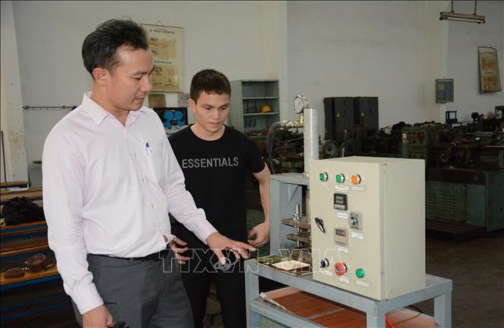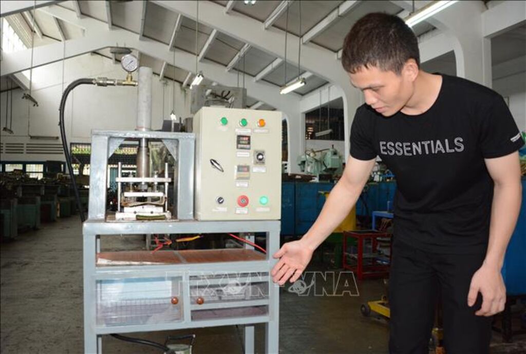 | Tiến sĩ Bùi Hệ Thống, giảng viên khoa Cơ khí, Trường Đại học Sư Phạm Kỹ thuật- Đại học Đà Nẵng hướng dẫn sinh viên nghiên cứu hoàn thiện "Máy ép chén đĩa từ vật liệu thân thiện môi trường". |