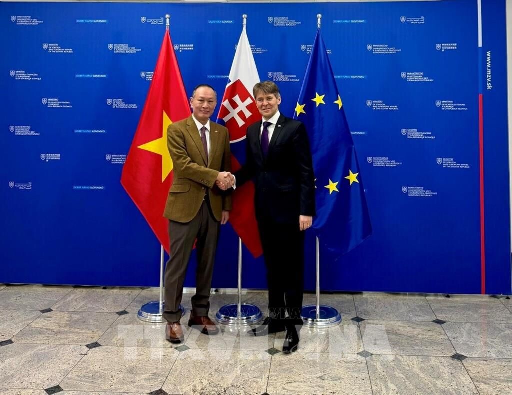 | Đại sứ Việt Nam tại Slovakia Phạm Trường Giang và Thứ trưởng Thứ nhất phụ trách chính trị Bộ Ngoại giao và các vấn đề châu Âu của Slovakia Marek Estok. Ảnh: TTXVN phát |