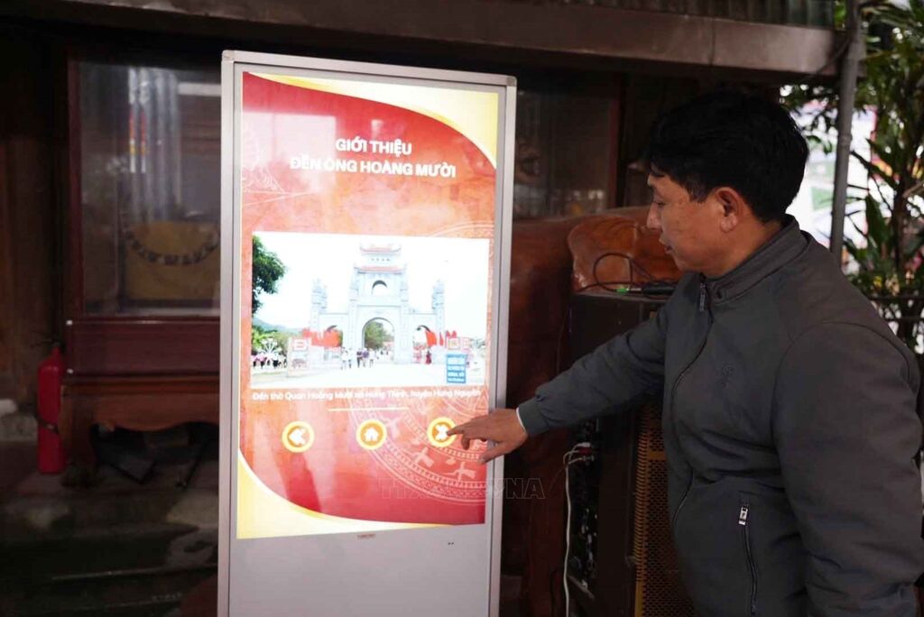 | Du khách sử dụng hệ thống kiosk để tìm hiểu thông tin về di tích đền ông Hoàng Mười. |