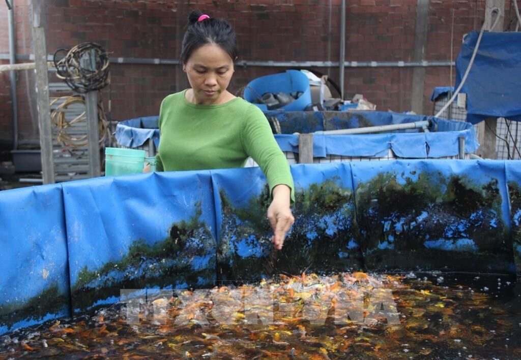 | Chăm sóc cá koi cảnh tại bể nuôi mô hình aquaponics. Ảnh tư liệu: Xuân Dự - TTXVN |