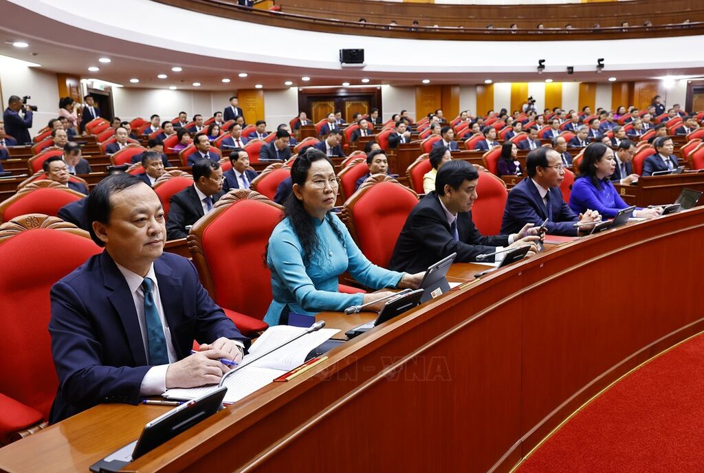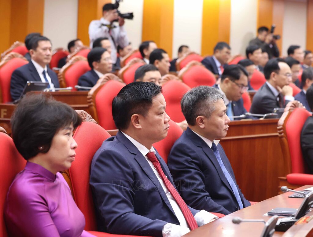 | Tổng Bí thư Tô Lâm và các đại biểu biểu quyết thông qua Nghị quyết Hội nghị Trung ương 2. |