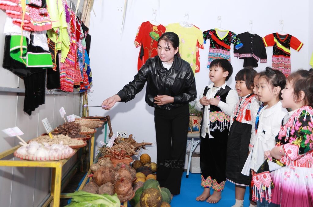 Thực hiện Đề án của Chính phủ về "Tăng cường tiếng Việt cho trẻ em mầm non, học sinh tiểu học vùng dân tộc thiểu số", Trường Mầm non Trung Chải, xã Pa Tần (Lai Châu) đã có nhiều phương pháp sáng tạo, mô hình hay, cách làm hiệu quả, sinh động, gần gũi với đời sống văn hóa bản địa. Đồng thời, học sinh còn được thường xuyên luyện đọc, luyện nói, luyện viết, tham gia các trò chơi dân gian, những hoạt động ngoài trời để tăng cường ngôn ngữ, tăng cường khả năng giao tiếp hàng ngày giúp trẻ tự tin vững bước vào môi trường mới. Ảnh: Quý Trung – TTXVN