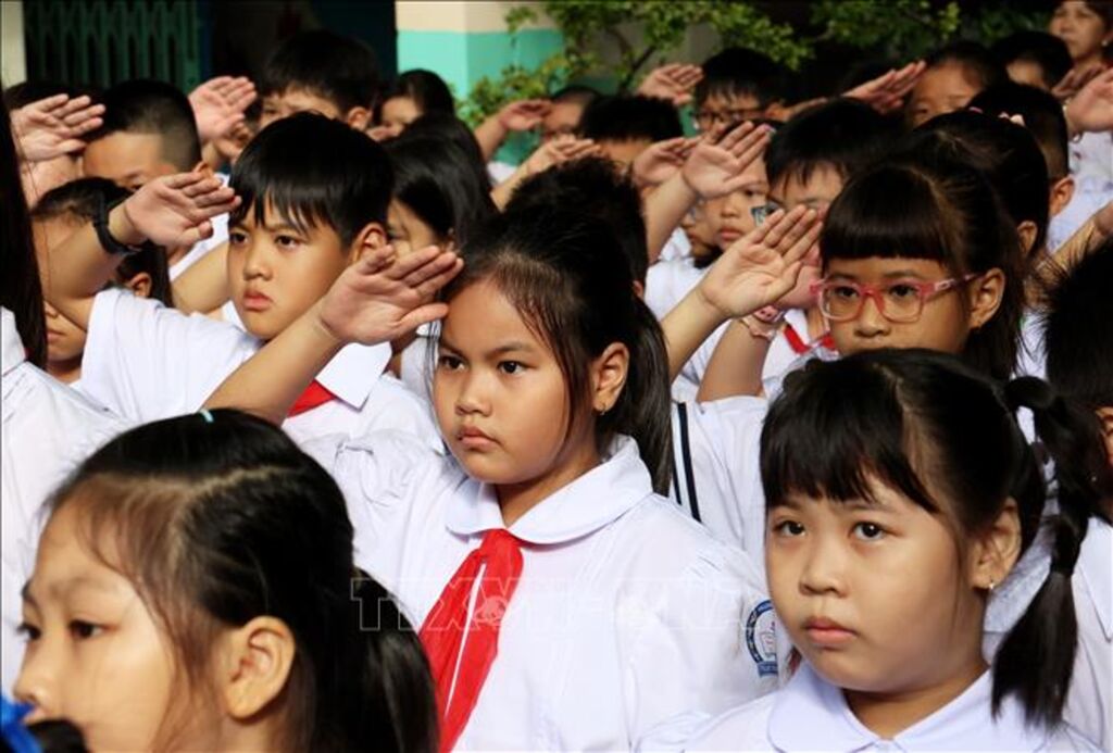 | Học sinh Trường Tiểu học Phạm Ngọc Thạch (quận Phú Nhuận, Thành phố Hồ Chí Minh) chào cờ đầu năm học mới. |