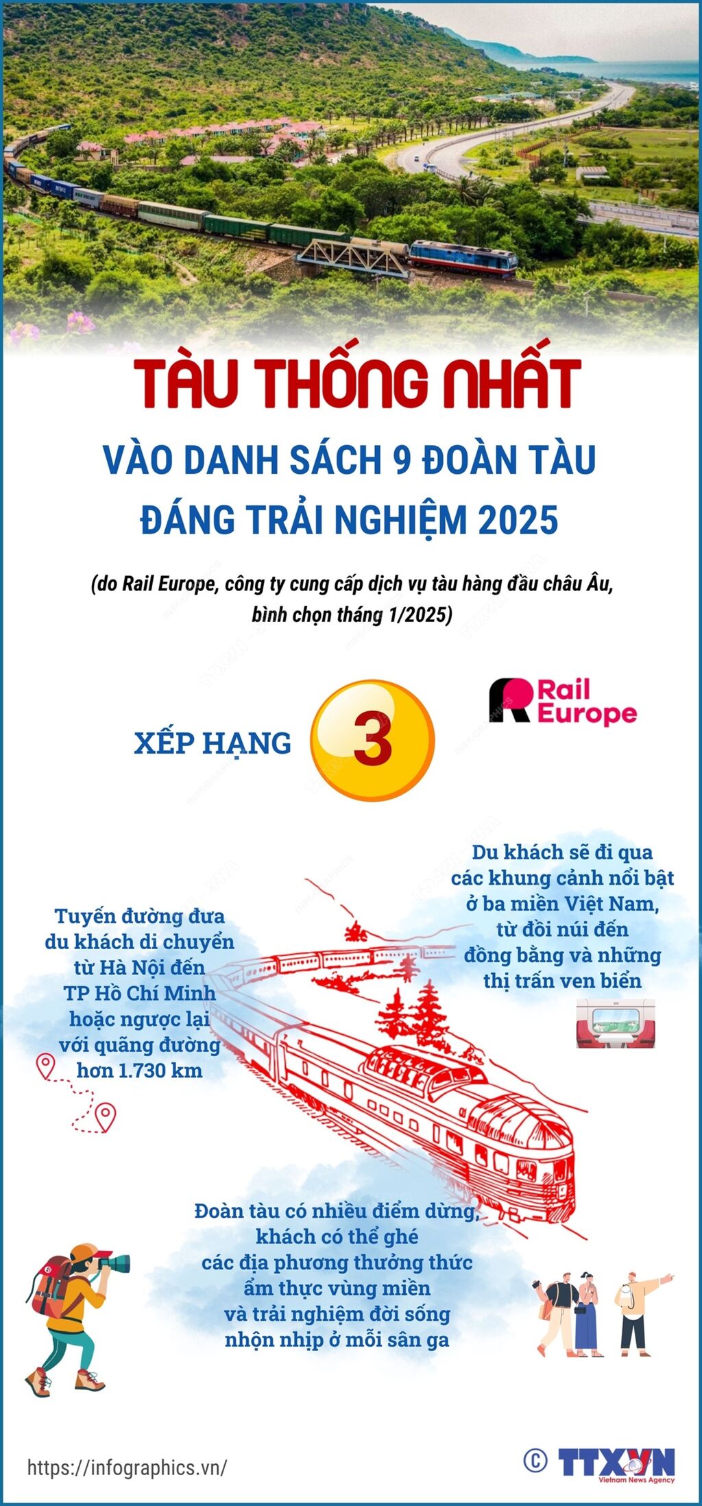 Tuyến đường sắt Bắc Nam với hành trình qua nhiều cảnh đẹp dọc Việt Nam lọt vào danh sách 9 cung đường sắt thế giới đáng thử 2025 do Rail Europe, công ty cung cấp dịch vụ tàu hàng đầu châu Âu, bình chọn tháng 1/2025.