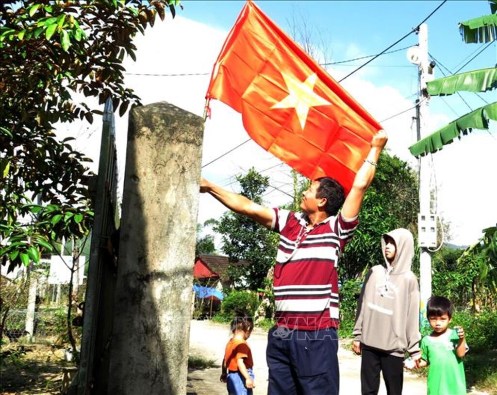 Cách nhà bà Gánh vài bước chân, anh Nguyễn Kim Minh tranh thủ treo cờ Tổ quốc lên vị trí cao trước cổng nhà rồi quấn đèn chớp nháy trang trí cho những chậu cây cảnh đang bung hoa trong sân vườn. Anh cũng không quên mở những bài nhạc Xuân sôi động để thưởng thức. Anh Minh chia sẻ, ngày xưa khổ sở, vất vả lắm, phải xài đến máy phát điện chạy dầu, rất bất tiện. Nay có điện lưới quốc gia rồi, mình thoải mái mà xài, tha hồ “ăn Tết” sớm. “Ngày Tết là phải có cờ Tổ quốc. Mình treo để thể hiện lòng yêu nước, lòng tự hào, nhắc nhớ đến thế hệ trước đã ngã xuống để có được độc lập, tự do hôm nay. Không những thế, hành động ý nghĩa đó còn tiếp thêm động lực, tinh thần mới, khí thế mới để mình tự tin hướng đến tương lai tốt đẹp với một gam màu tươi sáng.