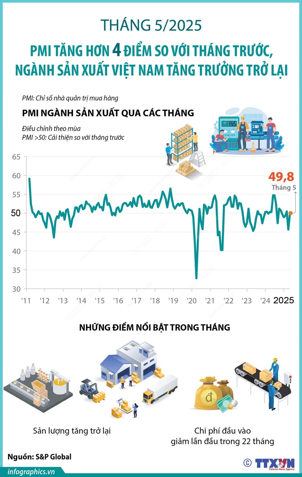 Chỉ số Nhà quản trị mua hàng (PMI) ngành sản xuất Việt Nam tháng 5/2025 đã tăng lên mức 49,8 điểm so với 45,6 điểm của tháng 4, cho thấy các điều kiện kinh doanh của ngành sản xuất đã gần như ổn định.