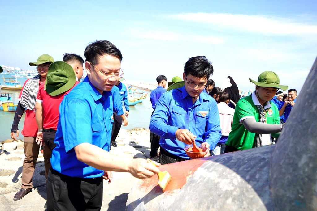 | Các đoàn viên, thanh niên ra quân trang trí bờ kè, chỉnh trang cảnh quan bờ biển. |