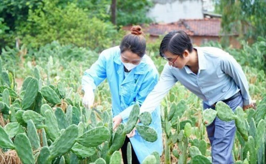| Anh Trần Văn Vũ và công nhân trao đổi về việc chăm sóc cây xương rồng tại vườn nguyên liệu. |