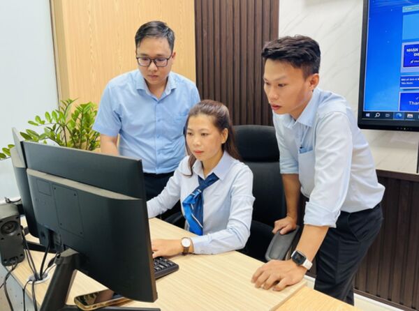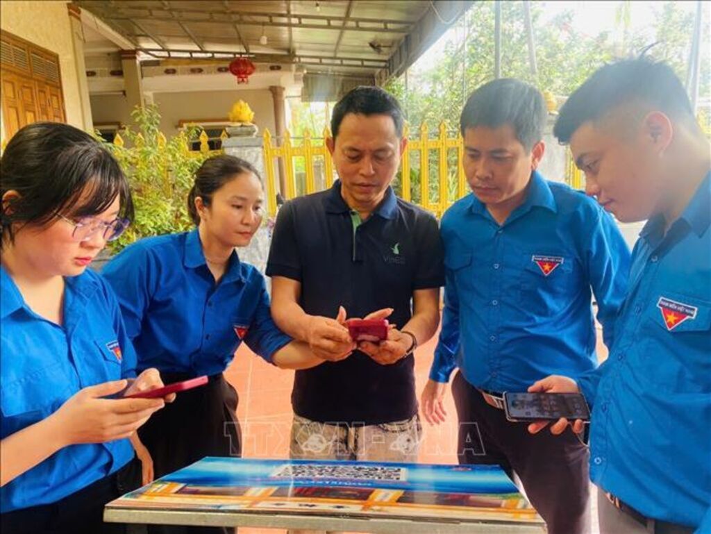 | Đoàn viên thanh niên Hà Tĩnh đến tận nhà hướng dẫn người dân sử dụng thanh toán không dùng tiền mặt. |