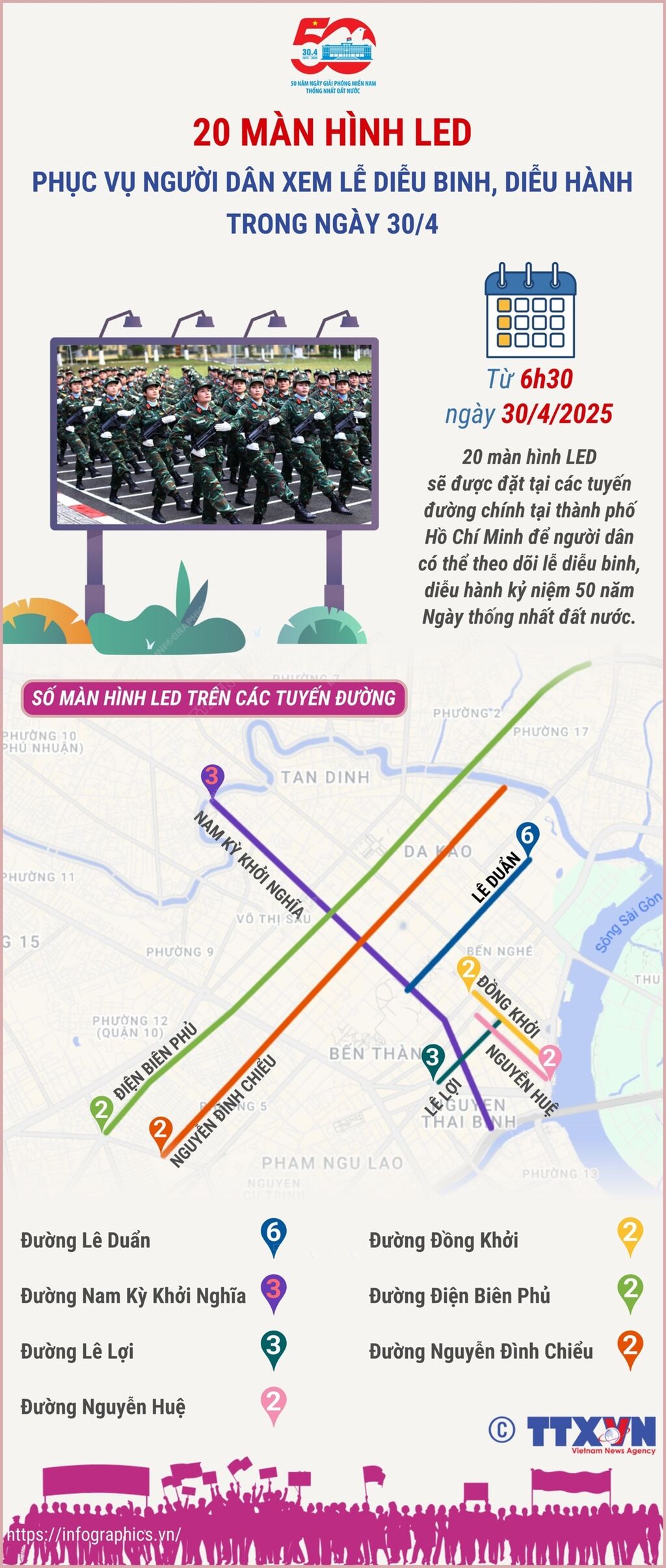 Lễ kỷ niệm 50 năm Ngày Giải phóng miền Nam, thống nhất đất nước là sự kiện đặc biệt quan trọng, có quy mô cấp quốc gia do Ban Chấp hành Trung ương Đảng, Quốc hội, Chủ tịch nước, Ủy ban Trung ương Mặt trận Tổ quốc Việt Nam và Thành phố Hồ Chí Minh thực hiện. Lễ kỷ niệm sẽ diễn ra từ 6 giờ 30 ngày 30/4/2025 trên đường Lê Duẩn (Quận 1) và tại lễ đài chính phía trước Hội trường Thống Nhất. Lễ diễu binh, diễu hành diễn ra cùng thời gian. Ngoài xem trực tiếp trên các tuyến đường diễn ra diễu binh, diễu hành, người dân cũng có thể theo dõi qua 20 màn hình LED được đặt tại 7 tuyến đường chính là: đường Lê Duẩn 6 màn hình, Nam Kỳ Khởi Nghĩa 3 màn hình, Lê Lợi 3 màn hình, Nguyễn Huệ 2 màn hình, Đồng Khởi 2 màn hình, Điện Biên Phủ 2 màn hình và Nguyễn Đình Chiểu 2 màn hình; hoặc xem trên sóng truyền hình, các nền tảng mạng xã hội.