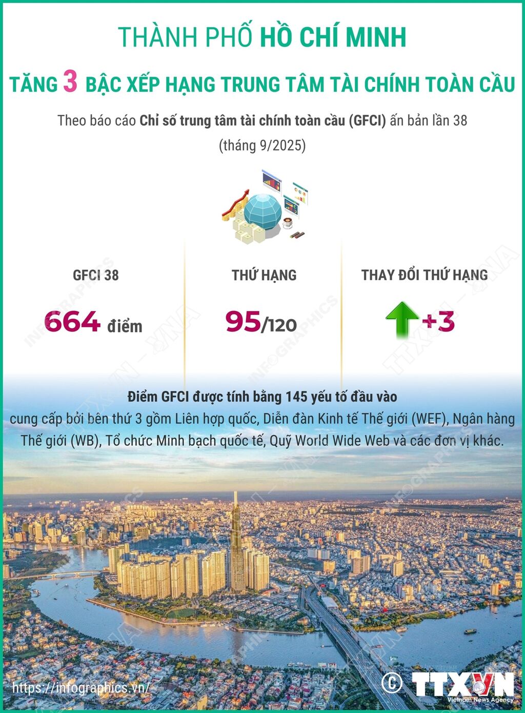 Theo Chỉ số Trung tâm Tài chính toàn cầu lần thứ 38 (GFCI 38) mới công bố, Thành phố Hồ Chí Minh đứng 95 trên 120 thành phố xếp hạng, tăng 3 bậc so với lần đánh giá trước đó.
