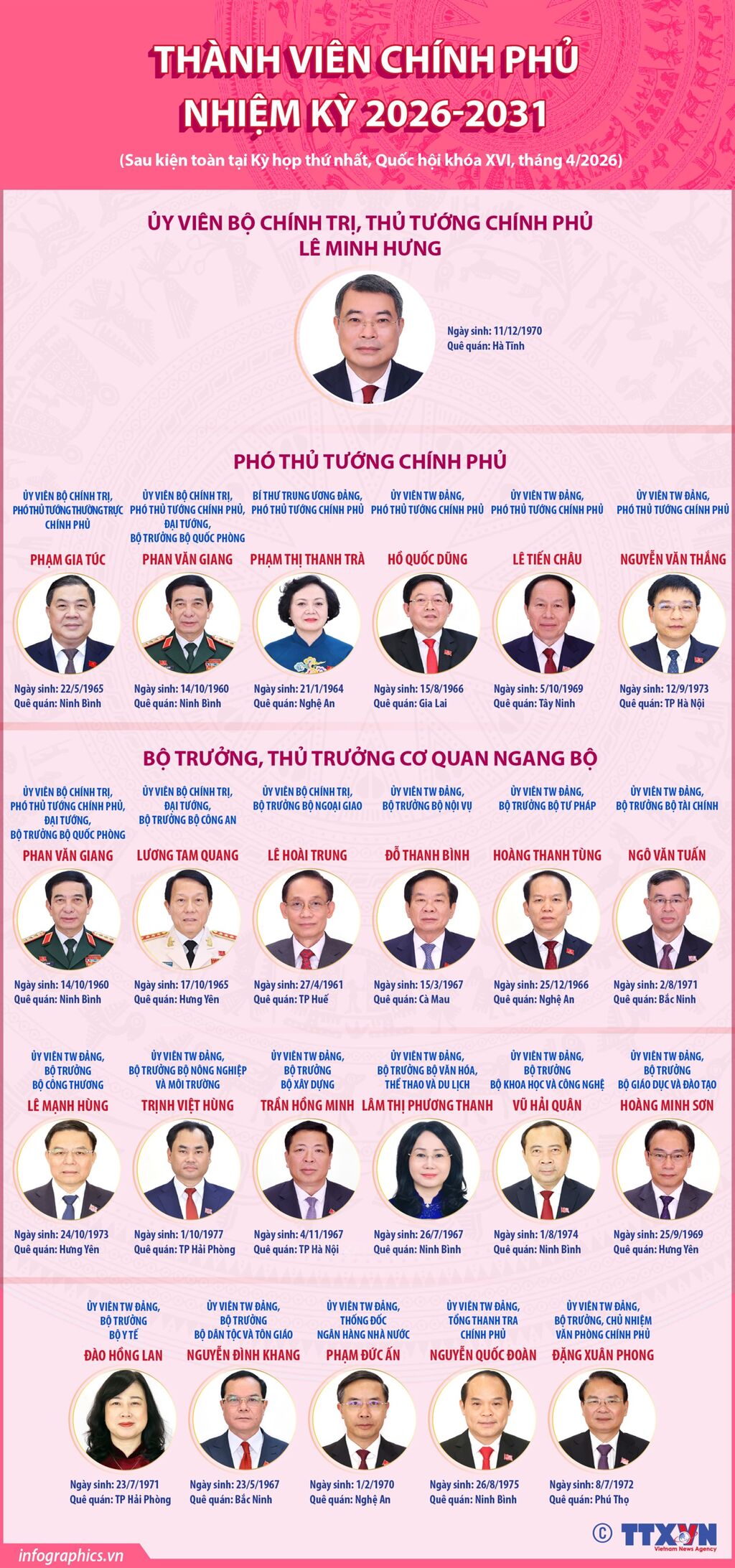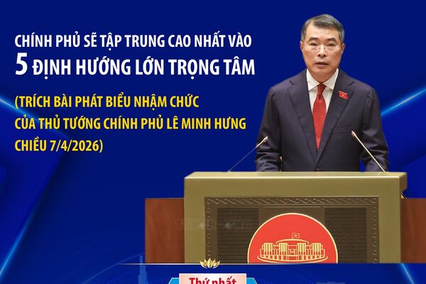Chiều 7/4/2026, tại Kỳ họp thứ Nhất, Quốc hội khóa XVI đã thông qua Nghị quyết bầu ông Lê Minh Hưng, Ủy viên Bộ Chính trị, Bí thư Trung ương Đảng, Trưởng Ban Tổ chức Trung ương giữ chức Thủ tướng Chính phủ nước Cộng hòa xã hội chủ nghĩa Việt Nam. Sau khi thực hiện nghi thức tuyên thệ, Thủ tướng Chính phủ Lê Minh Hưng đã phát biểu nhậm chức. Trong bài phát biểu, Thủ tướng Chính phủ Lê Minh Hưng nêu rõ: Chính phủ sẽ tập trung cao nhất vào 5 định hướng lớn trọng tâm.
