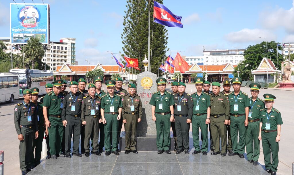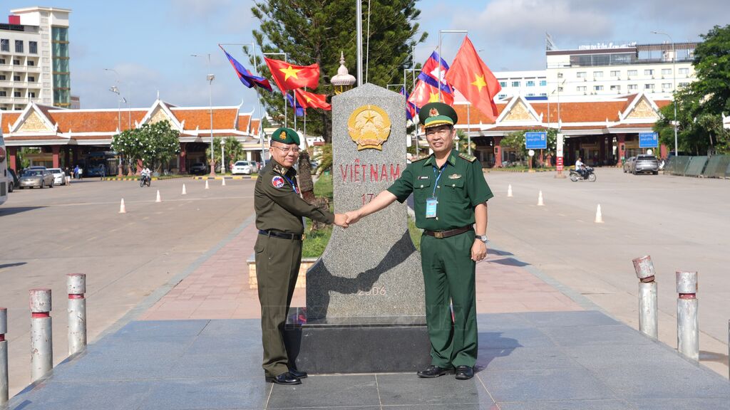 | Đại tá Nguyễn Thanh Hải, Phó Chủ nhiệm Chính trị, Bộ đội Biên phòng Việt Nam và Trung tướng Tien Sophonrnvong, Phó Tham mưu trưởng, Cục trưởng Cục Biên phòng Campuchia tại Cột mốc 171 Cửa khẩu Quốc tế Mộc Bài - Bavet. |