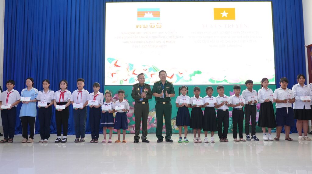 | Đại diện của Bộ Chỉ huy Bộ đội Biên phòng tỉnh Tây Ninh và Bộ Tư lệnh Lục quân, Bộ Tư lệnh Hiến binh Quân đội Hoàng gia Campuchia đã tặng học bổng cho học sinh có hoàn cảnh khó khăn hai bên biên giới của hai nước. |