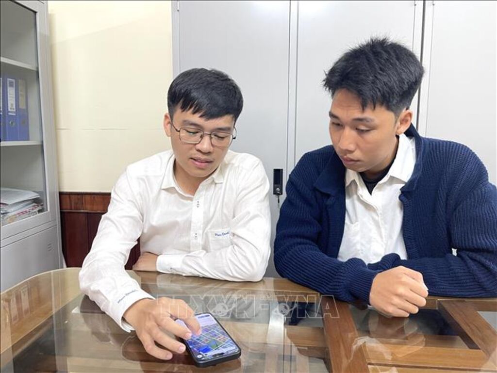 | Anh Lê Quang Sơn, Bí thư Đoàn Thanh niên Ban Quản lý Khu Kinh tế tỉnh Quảng Trị (trái) giới thiệu cách thức truy cập kho dữ liệu trên điện thoại thông minh. |