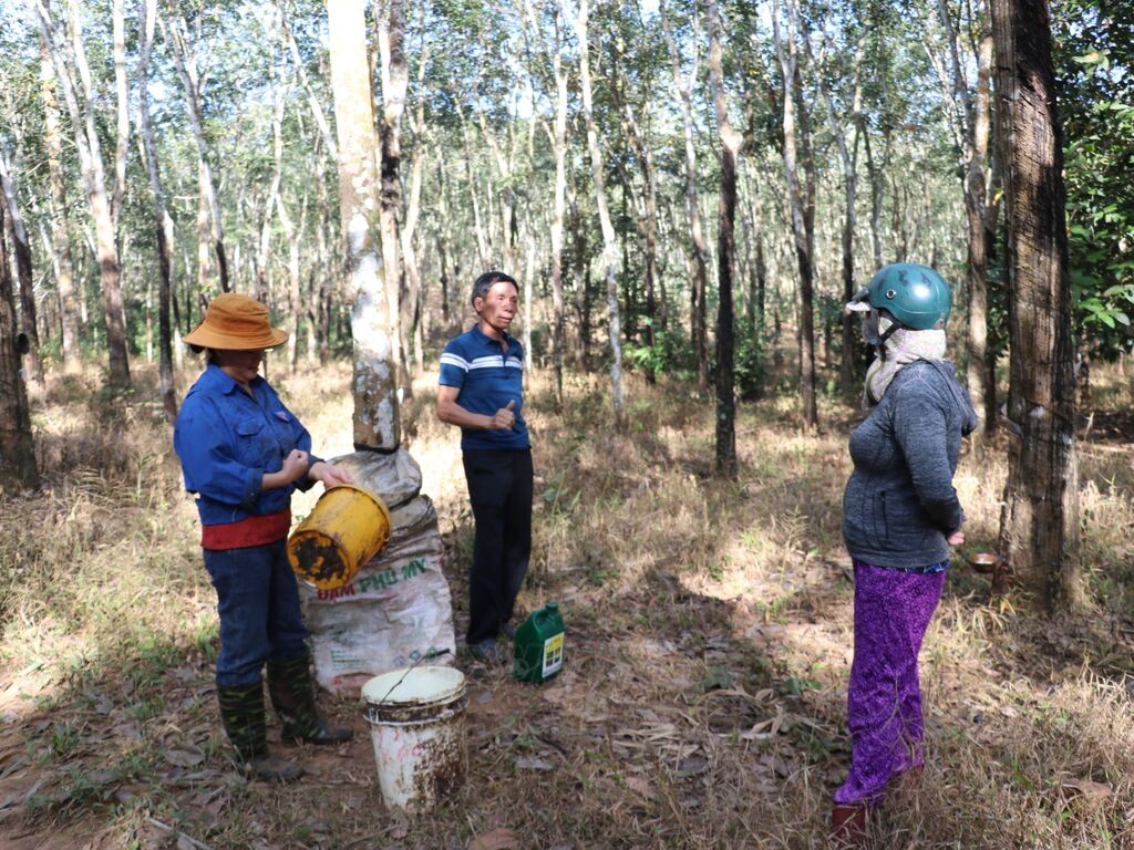 | Ông Lâm Văn Giàng thăm hỏi các hộ dân cạo mủ cho gia đình. |