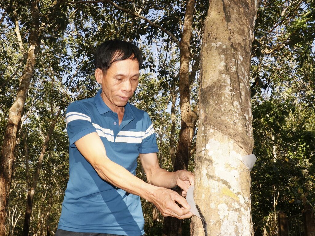 | Ông Lâm Văn Giàng kiểm tra vườn cao su đã khai thác hơn 10 năm. |