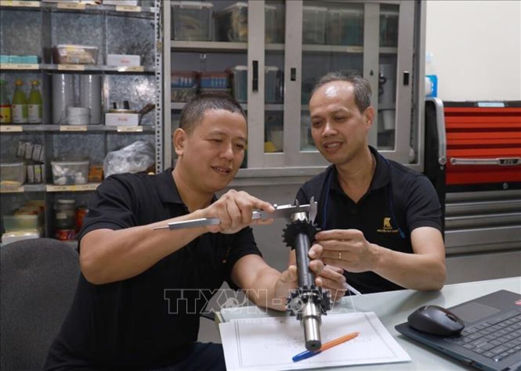 | Kỹ sư Nguyễn Duy Khuê (bên phải) trao đổi với đồng nghiệp về chế tạo chi tiết máy. |