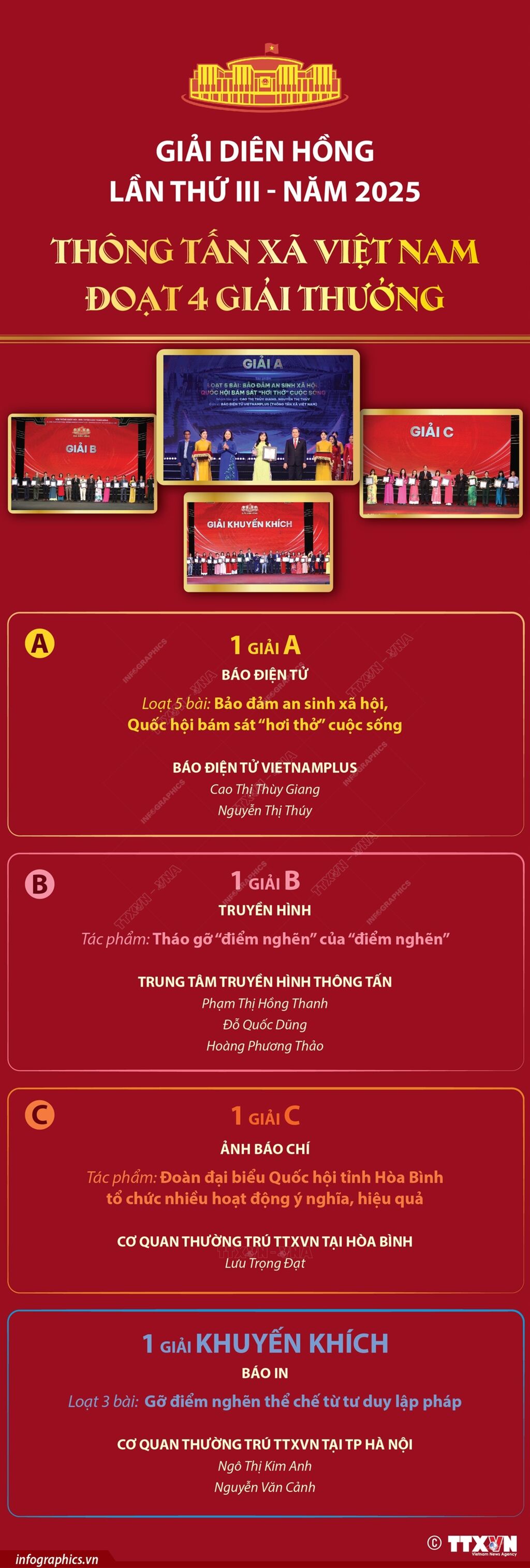 Tối 5/1/2025, Lễ Tổng kết và trao Giải Báo chí toàn quốc về Quốc hội và Hội đồng nhân dân (Giải Diên Hồng) lần thứ ba năm 2025 đã được tổ chức tại Hà Nội, đúng vào dịp kỷ niệm 79 năm Ngày Tổng tuyển cử đầu tiên bầu Quốc hội Việt Nam (6/1/1946 - 6/1/2025). Thông tấn xã Việt Nam giành 4 Giải thưởng gồm: 1 Giải A, 1 Giải B, 1 Giải C và 1 Giải Khuyến khích.