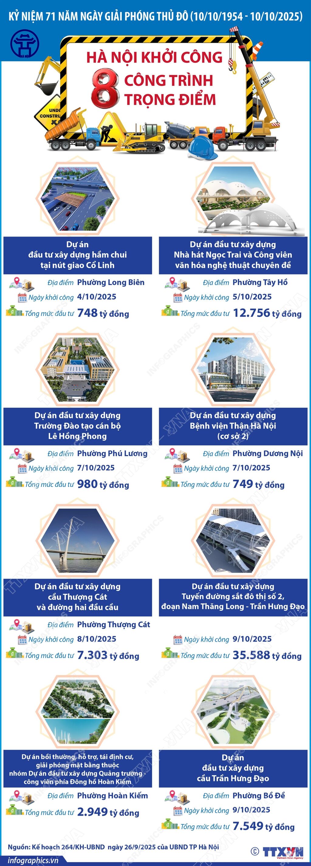 Nhân kỷ niệm 71 năm Ngày Giải phóng Thủ đô (10/10/1954 - 10/10/2025), Hà Nội khởi công 8 công trình, dự án quan trọng trong các lĩnh vực hạ tầng giao thông, y tế, văn hóa và đô thị, góp phần tạo diện mạo mới cho thành phố. Trong đó, có nhiều dự án lớn như: Dự án Nhà hát Ngọc Trai và Công viên văn hóa nghệ thuật chuyên đề; Dự án tuyến đường sắt số 2, đoạn Nam Thăng Long - Trần Hưng Đạo; Dự án đầu tư xây dựng Quảng trường - công viên phía Đông hồ Hoàn Kiếm; Dự án đầu tư xây dựng cầu Trần Hưng Đạo; Dự án đầu tư xây dựng cầu Thượng Cát và đường hai đầu cầu…
