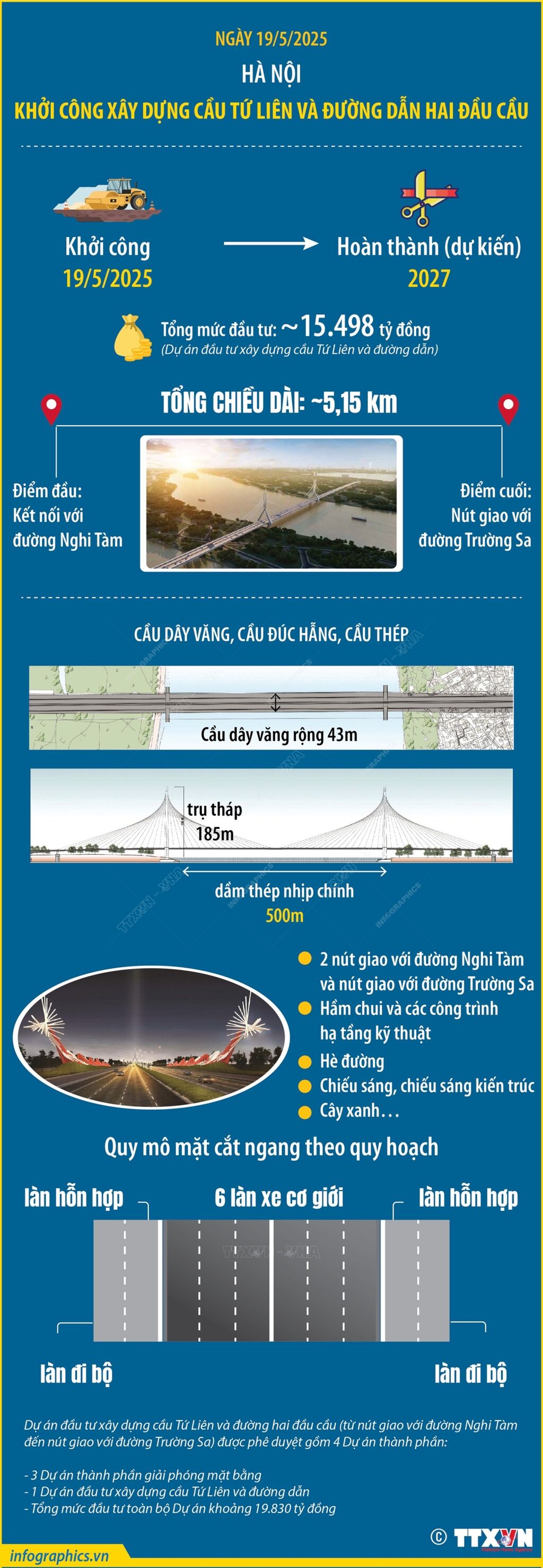 Sáng 19/5/2025, tại Hà Nội, Thủ tướng Chính phủ Phạm Minh Chính dự lễ khởi công dự án đầu tư xây dựng cầu Tứ Liên và đường hai đầu cầu từ nút giao với đường Nghi Tàm đến nút giao với đường Trường Sa có tổng mức đầu tư gần 20.000 tỷ đồng. Dự án cầu Tứ Liên là dự án quan trọng được lãnh đạo Đảng, Chính phủ rất quan tâm, yêu cầu cần sớm triển khai, theo chỉ đạo của Tổng Bí thư Tô Lâm tại buổi làm việc với Ban Thường vụ Thành ủy Hà Nội ngày 27/11/2024 và Nghị quyết số 77/NQ-CP phiên họp Chính phủ thường kỳ tháng 3/2025 và Hội nghị trực tuyến Chính phủ với địa phương. Đây là công trình cầu vượt sông Hồng đầu tiên khởi công trong năm 2025 để tạo đà tiếp tục khởi công 6 công trình cầu lớn như cầu Trần Hưng Đạo, cầu Thượng Cát, cầu Ngọc Hồi (Vành đai 3,5), cầu Hồng Hà, cầu Mễ Sở (Vành đai 4), cầu Vân Phúc…