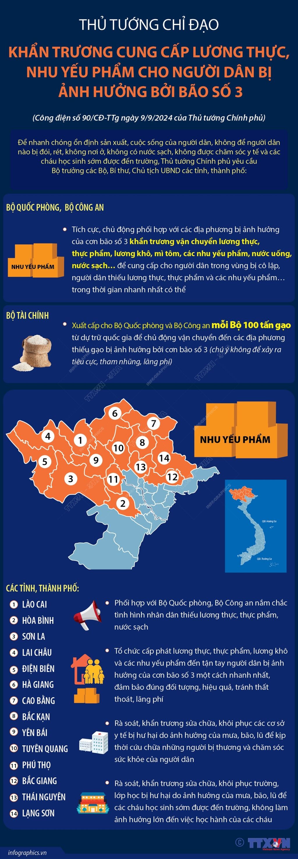 Bộ trưởng Bộ Quốc phòng, Bộ trưởng Công an chỉ đạo các đơn vị chức năng tích cực, chủ động phối hợp với các địa phương bị ảnh hưởng của cơn bão số 3 khẩn trương vận chuyển lương thực, thực phẩm, lương khô, mì tôm, các nhu yếu phẩm, nước uống, nước sạch… để cung cấp cho người dân trong vùng bị cô lập, người dân thiếu lương thực, thực phẩm và các nhu yếu phẩm… trong thời gian nhanh nhất có thể.
