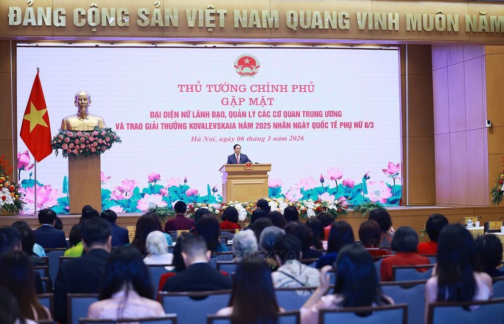 Sáng 6/3/2026, tại Hà Nội, Thủ tướng Phạm Minh Chính gặp mặt đại diện nữ lãnh đạo, quản lý các cơ quan trung ương và trao Giải thưởng Kovalevskaia năm 2025 nhân Ngày quốc tế phụ nữ 8/3. Ảnh: Dương Giang-TTXVN