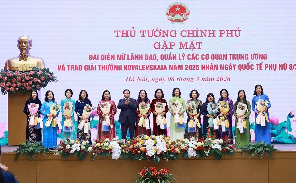Thủ tướng Phạm Minh Chính tặng quà chúc mừng đại diện nữ lãnh đạo, quản lý các cơ quan trung ương. Ảnh: Dương Giang-TTXVNThủ tướng Phạm Minh Chính với đại diện nữ lãnh đạo, quản lý các cơ quan trung ương và trao các tác giả nhận Giải thưởng Kovalevskaia năm 2025. Ảnh: Dương Giang-TTXVNThủ tướng Phạm Minh Chính phát biểu tại buổi gặp mặt đại diện nữ lãnh đạo, quản lý các cơ quan trung ương và trao Giải thưởng Kovalevskaia năm 2025. Ảnh: Dương Giang-TTXVN