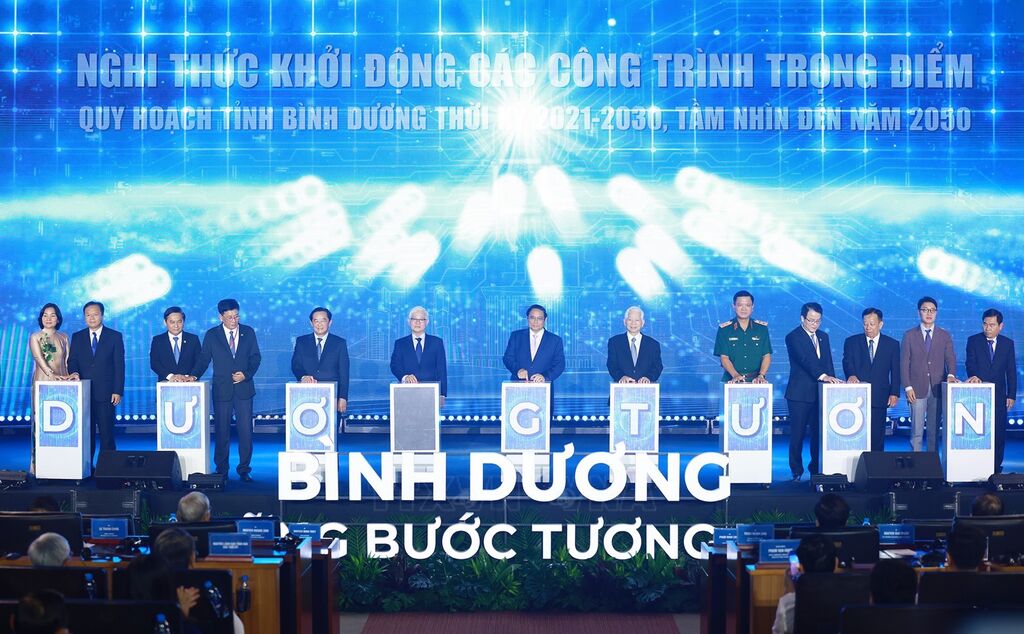Để thể hiện sự khích lệ, cam kết, đồng lòng trong việc thực hiện bản quy hoạch, Thủ tướng Phạm Minh Chính và lãnh đạo các bộ, ngành Trung ương và tỉnh Bình Dương thực hiện nghi thức khởi động thực hiện Quy hoạch tỉnh và các dự án, công trình trọng điểm chiến lược ở Bình Dương.