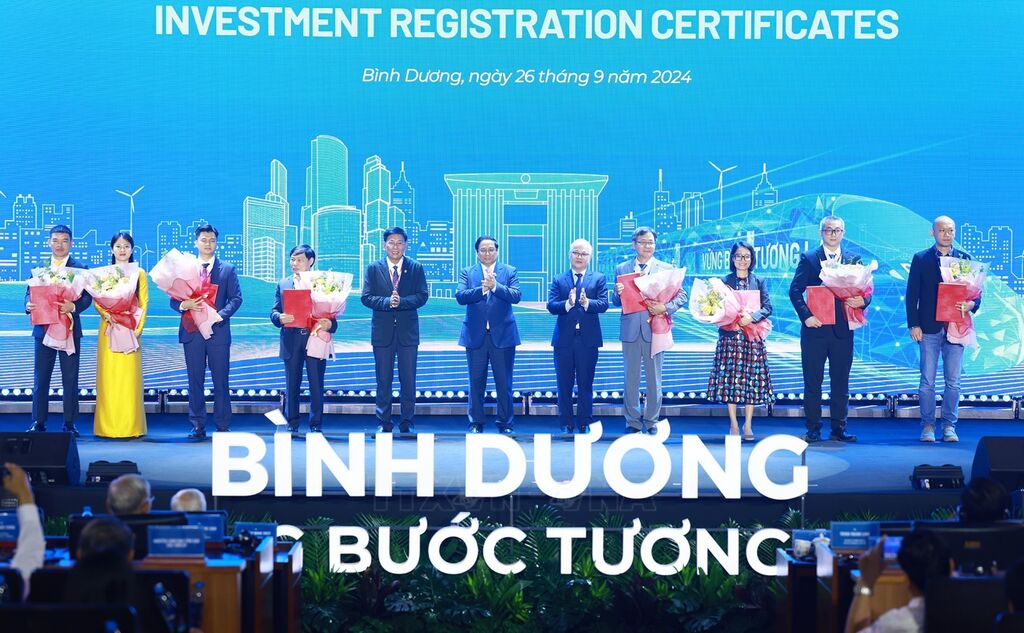 * Tại Hội nghị, trước sự chứng kiến của Thủ tướng, tỉnh Bình Dương trao Quyết định chấp thuận chủ trương đầu tư và Giấy chứng nhận đăng ký đầu tư cho 8 dự án tiêu biểu được cấp phép năm 2024 với tổng vốn đầu tư đăng ký hơn 1,8 tỷ USD trong các lĩnh vực hạ tầng, đô thị, dệt may, cơ khí… Đến nay Bình Dương đứng thứ 3 cả nước về thu hút vốn FDI với hơn 4.300 dự án còn hiệu lực, tổng vốn đầu tư đăng ký hơn 41 tỷ USD, chiếm 8,5% tổng vốn đầu tư cả nước.