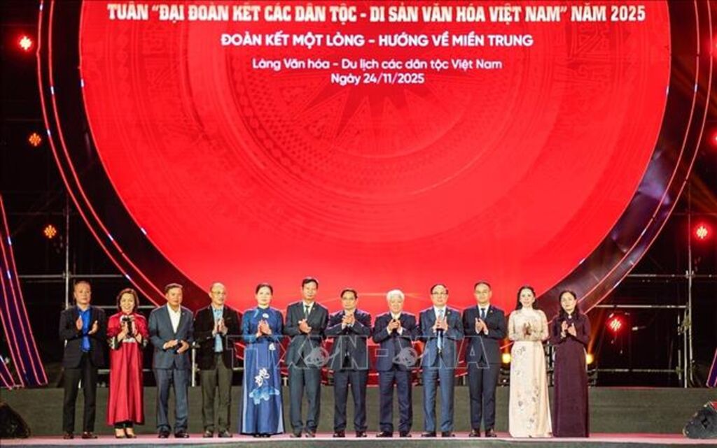 Tối 24/11, Lễ khai mạc Tuần “Đại đoàn kết các dân tộc - Di sản Văn hóa Việt Nam” năm 2025 với chủ đề “Đoàn kết một lòng - Hướng về miền Trung” đã diễn ra tại Làng Văn hóa - Du lịch các dân tộc Việt Nam (Đoài Phương, Hà Nội).