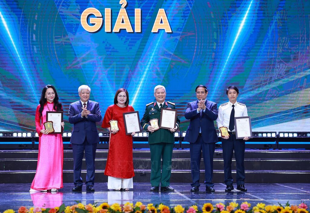 | Thủ tướng Phạm Minh Chính và Chủ tịch UBTW MTTQ Việt Nam Đỗ Văn Chiến trao Giải A cho 4 tác giả, nhóm tác giả đoạt giải. |