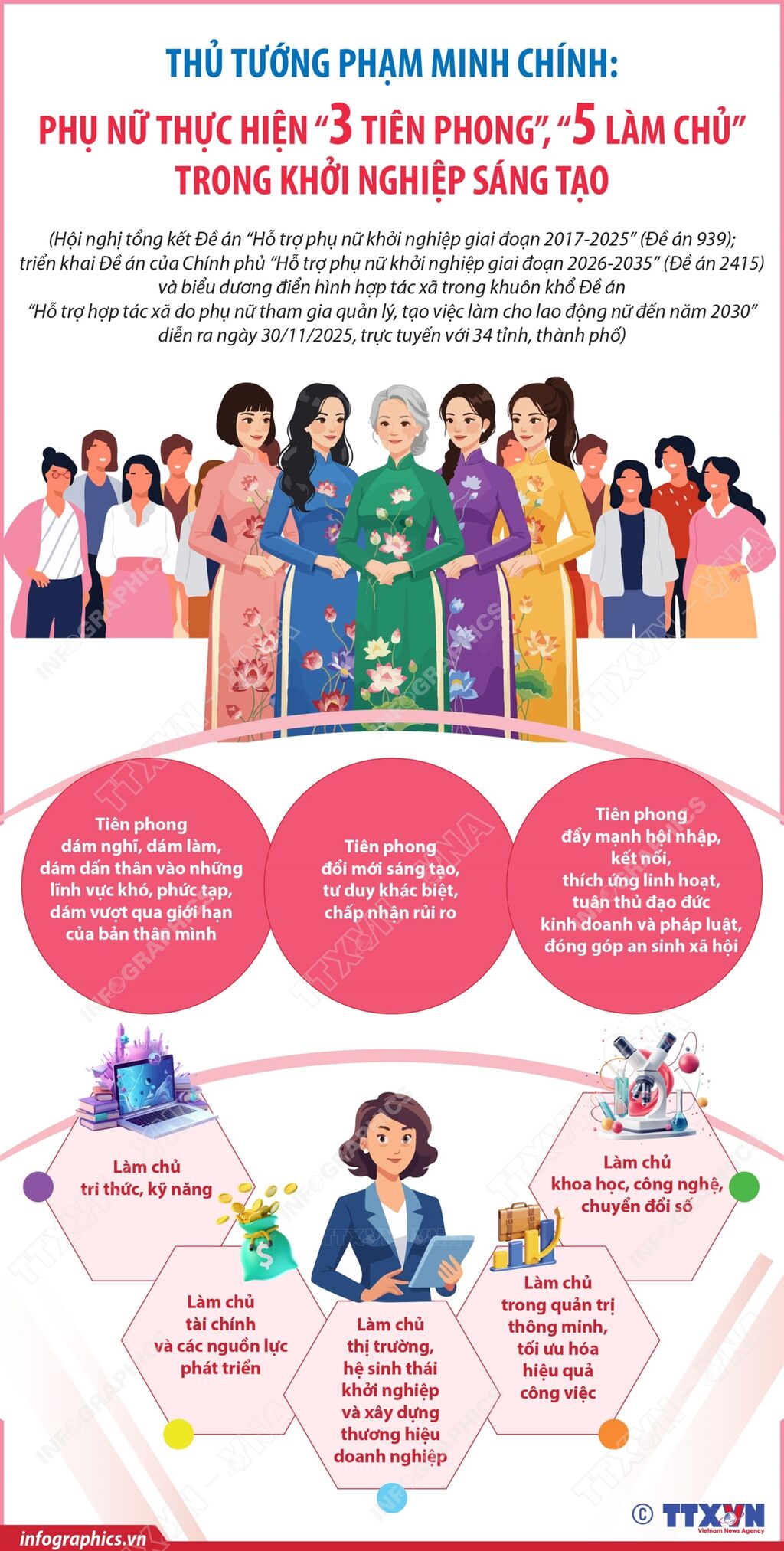 Tại Hội nghị tổng kết Đề án “Hỗ trợ phụ nữ khởi nghiệp giai đoạn 2017 - 2025” (Đề án 939); triển khai Đề án của Chính phủ “Hỗ trợ phụ nữ khởi nghiệp giai đoạn 2026 - 2035” (Đề án 2415) và biểu dương điển hình hợp tác xã trong khuôn khổ Đề án “Hỗ trợ hợp tác xã do phụ nữ tham gia quản lý, tạo việc làm cho lao động nữ đến năm 2030” diễn ra ngày 30/11/2025, Thủ tướng Chính phủ Phạm Minh Chính đề nghị phụ nữ Việt Nam phát huy tinh thần “3 tiên phong”; “5 làm chủ” trong khởi nghiệp sáng tạo theo tinh thần Đề án 2415. Trong đó “3 tiên phong” gồm: Tiên phong dám nghĩ, dám làm, dám dấn thân vào những lĩnh vực khó, phức tạp, dám vượt qua giới hạn của bản thân mình; Tiên phong đổi mới sáng tạo, tư duy khác biệt, chấp nhận rủi ro; Tiên phong đẩy mạnh hội nhập, kết nối, thích ứng linh hoạt, tuân thủ đạo đức kinh doanh và pháp luật, đóng góp an sinh xã hội. Đồng thời phụ nữ cần thực hiện “5 làm chủ” gồm: Làm chủ tri thức, kỹ năng; Làm chủ khoa học, công nghệ, chuyển đổi số; Làm chủ tài chính và các nguồn lực phát triển; Làm chủ trong quản trị thông minh, tối ưu hóa hiệu quả công việc; Làm chủ thị trường, hệ sinh thái khởi nghiệp và xây dựng thương hiệu doanh nghiệp.