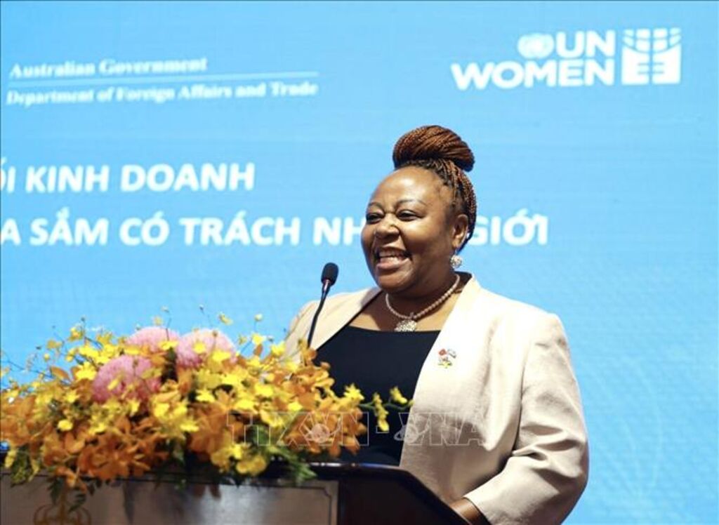 | Bà Caroline Nyamayemombe, Trưởng đại diện Cơ quan Liên hợp quốc về Bình đẳng giới và Trao quyền cho Phụ nữ (UN Women) tại Việt Nam phát biểu tại hội thảo kết nối kinh doanh “Đa dạng nhà cung cấp và mua sắm có trách nhiệm giới”. |