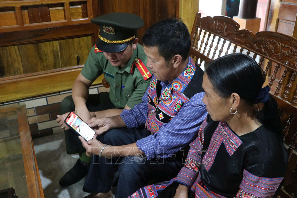 | Lực lượng Công an xã Pà Cò (Phú Thọ) hướng dẫn người dẫn sử dụng dịch vụ công nghệ. |
