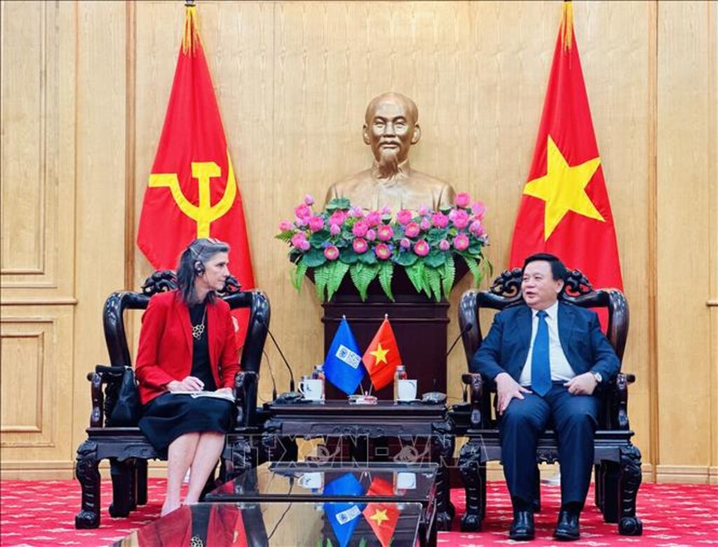 Chiều 17/10, tại Hà Nội, Giáo sư, Tiến sĩ Nguyễn Xuân Thắng, Ủy viên Bộ Chính trị, Giám đốc Học viện Chính trị Quốc gia Hồ Chí Minh, Chủ tịch Hội đồng Lý luận Trung ương tiếp và làm việc với bà Ramla Khalidi, Trưởng Đại diện Thường trú Chương trình phát triển Liên hợp quốc (UNDP) tại Việt Nam.