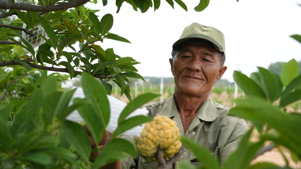 | Nông dân trồng na ở huyện Tân Châu, tỉnh Tây Ninh kiểm tra quả na trước khi thu hoạch. |